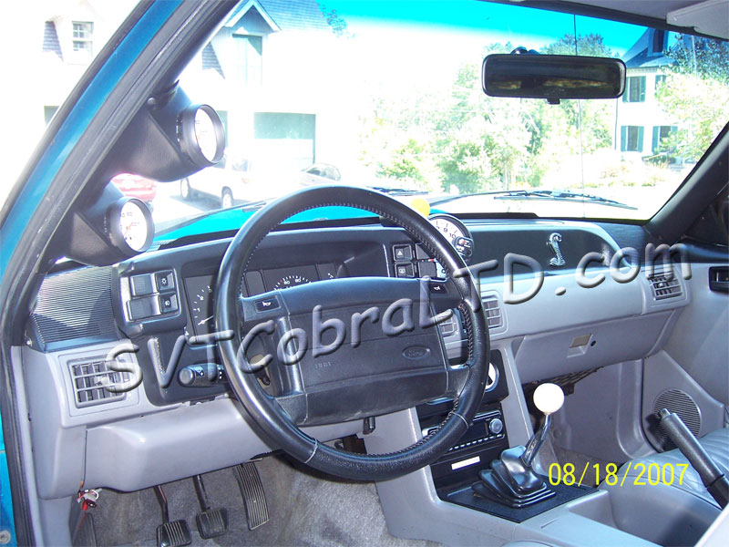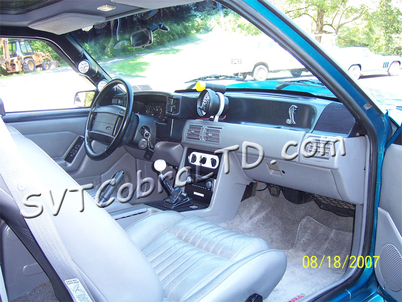 Grey leather interior (stock), power lumbar seats (stock), Cobra emblem, Pioneer P9300 head unit, JBL door speakers, Infinity dash speakers, Panasonic rear speakers, White face A/C gauges, Hurst short shifter, Autometer dual gauge pod, Autometer Phantom fuel pressure gauge, Autometer Phantom oil pressure gauge, and Autometer 5" Tach with shift light. Battery is located in the trunk to clean up the look of the engine bay.